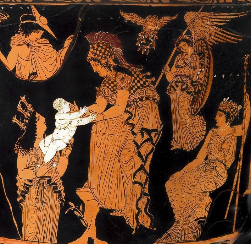 During the struggle, his semen fell on her thigh, and Athena, in disgust, wiped it away with a scrap of wool (ἔριον, erion) and flung it to the earth (χθών, chthôn). As she fled, Erichthonius was born from the semen that fell to the earth. Athena, wishing to raise the child in secret, placed him in a small box. And then made sure no one would ever find out by giving him away.