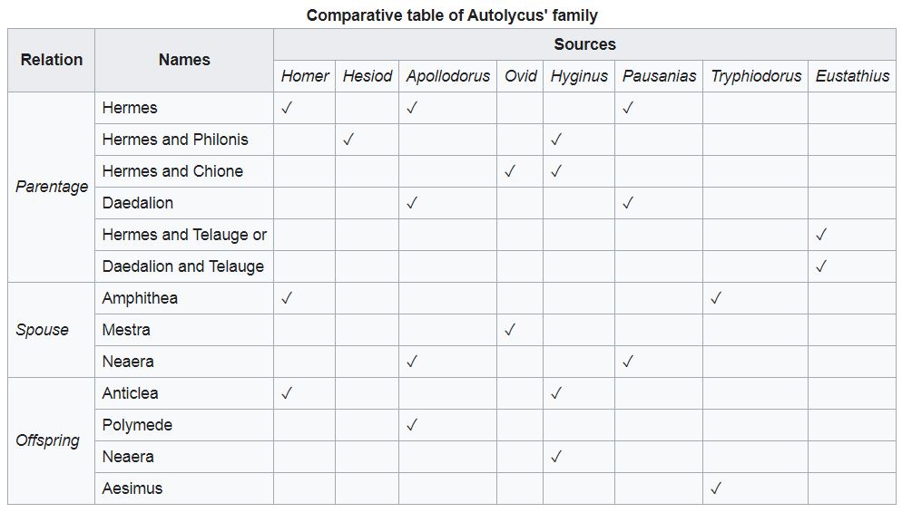 Depending on the source, Autolycus was the husband of Mestra (who could change her shape at will and was a daughter of Erysichthon), or of Neaera, or of Amphithea.
