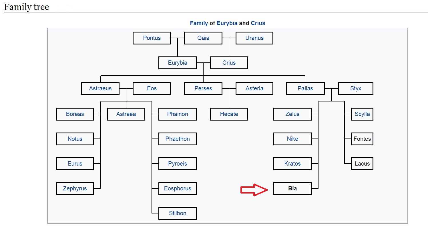 Bia was a daughter of the Titan Pallas, and his wife, the Oceanid Styx, and thus Bia was a sister to Nike (Victory), Cratus (Strength) and Zelos (Zeal).