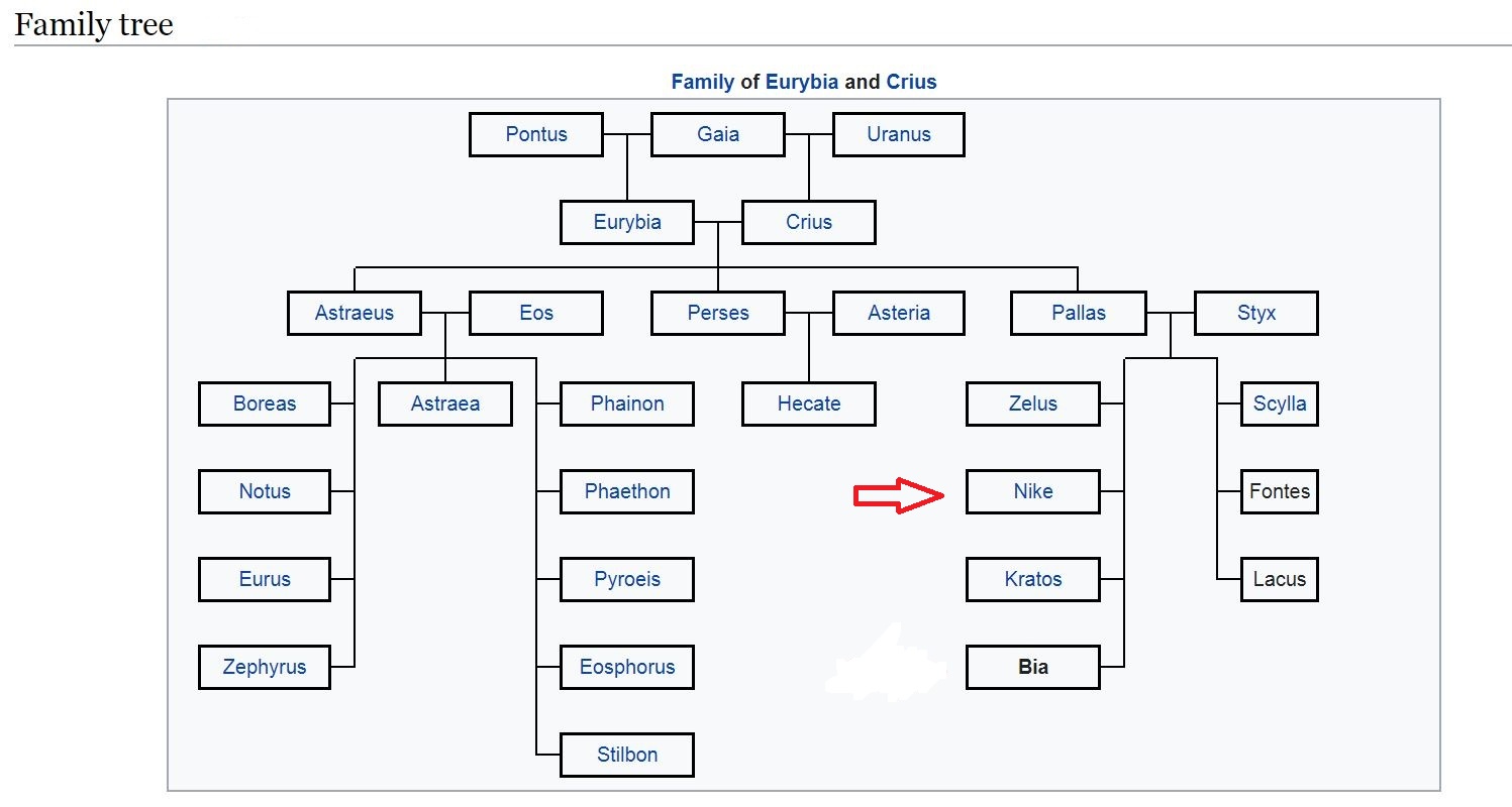 The goddess Nike was the daughter of the second generation Titan Pallas, Pallas was the early Greek god of Battle, and the Oceanid Styx. Thus Nike was also sibling to Zelos (Zeal), Bia (Force) and Cratus (Strength).