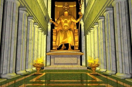 The statue of Zeus was built in 466 BC. It occupied the entire width of the aisle of the temple in Olympia that was built to house it, and was 12m (40 feet) tall. The statue was made of gold and ivory...