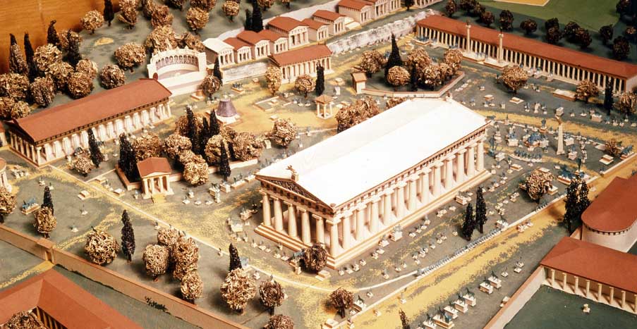 Στη δυτική Πελοπόννησο, στην πανέμορφη κοιλάδα του ποταμού Αλφειού, άνθισε το πιο δοξασμένο ιερό της αρχαίας Ελλάδας, που ήταν αφιερωμένο στον πατέρα των θεών, τον Δία. Απλώνεται στους νοτιοδυτικούς πρόποδες του κατάφυτου Κρονίου λόφου, μεταξύ των ποταμών Αλφειού και Κλαδέου, που ενώνονται σε αυτή την περιοχή. Παρά την απομονωμένη θέση της κοντά στη δυτική ακτή της Πελοποννήσου, η Ολυμπία καθιερώθηκε στο πανελλήνιο ως το σημαντικότερο θρησκευτικό και αθλητικό κέντρο. Εδώ γεννήθηκαν οι σπουδαιότεροι αγώνες της αρχαίας Ελλάδας, οι Ολυμπιακοί, που γίνονταν κάθε τέσσερα χρόνια προς τιμήν του Δία, ένας θεσμός με πανελλήνια ακτινοβολία και λάμψη από την αρχαιότητα μέχρι σήμερα. Η απαρχή της λατρείας και των μυθικών αναμετρήσεων που έλαβαν χώρα στην Ολυμπία χάνεται στα βάθη των αιώνων. Οι τοπικοί μύθοι σχετικά με τον ισχυρό βασιλιά της περιοχής, τον ξακουστό Πέλοπα, και τον ποτάμιο θεό Αλφειό, φανερώνουν τους ισχυρούς δεσμούς του ιερού τόσο με την Ανατολή όσο και με τη Δύση.