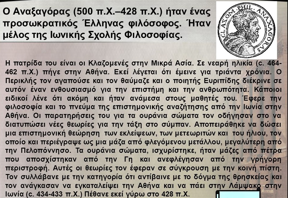 Ο Αναξαγόρας (~500-428 π.Χ) ήταν σπουδαίος αρχαίος Έλληνας φιλόσοφος και αστρονόμος. Γεννήθηκε στις Κλαζομενές της Ιωνίας περί το 500 π.Χ. Ήταν γιος του Ηγησίβουλου ή Εύβουλου και ανήκε σε πλούσιο και αριστοκρατικό γένος. Σε ηλικία 20 ετών εγκαταστάθηκε στην Αθήνα, επιδιδόμενος σε φιλοσοφικές σπουδές, όπου και έζησε εκεί επί 30 χρόνια. Σύμφωνα όμως με την παράδοση κατηγορήθηκε για ασέβεια και αναγκάστηκε να εγκαταλείψει την πόλη.