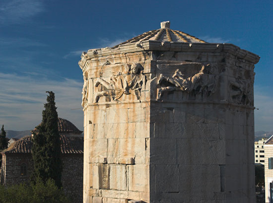 Το έργο ήταν από Πεντελικό μάρμαρο. Μικρό οκτάγωνο με κάθε πλευρά μήκους 3,20μ. Μέσα σ’αυτό λειτουργούσε ωρολόγιο με νερό και στην κορυφή της κωνικής στέγης υπήρχε ορειχάλκινος Τρίτων, που περιστρεφόταν σύμφωνα με τον πνέοντα άνεμο και έδειχνε με ορείχαλκο ραβδί έναν από τους 8 ανέμους, που απεικονίζονται προσωποποιημένοι στο επάνω μέρος κάθε πλευράς.
