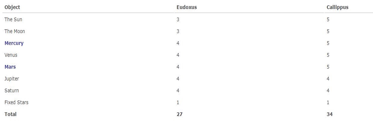 Παρατήρησε τις κινήσεις των πλανητών και προσπάθησε να χρησιμοποιήσει σύστημα Εύδοξος το οποίο αποτελείτο από σφαίρες που συνδέονταν μεταξύ τους για να υπολογίσει τις μετακινήσεις τους. Ωστόσο, βρήκε ότι 27 σφαίρες ήταν ανεπαρκής αριθμός για τις πλανητικές κινήσεις, έτσι και πρόσθεσε επτά έχοντας σύνολο 34. Σύμφωνα με την περιγραφή στα Μετά τα Φυσικά του Αριστοτέλους, πρόσθεσε δύο σφαίρες για τον Ήλιο, δύο για τη Σελήνη, και από μία για τον Ερμή, την Αφροδίτη και τον Άρη.