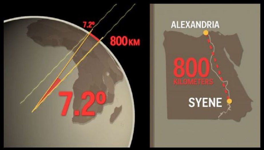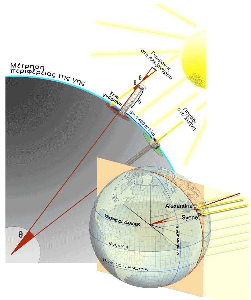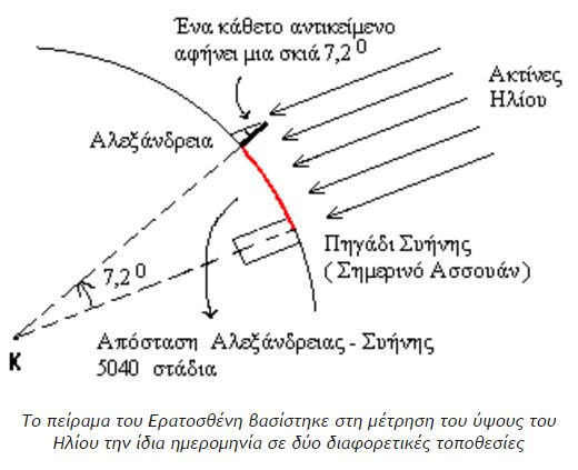 Το μεσημέρι της ημέρας του θερινού ηλιοστασίου ο Ερατοσθένης μέτρησε το ύψος του Ηλίου στην πόλη στην οποία κατοικούσε, την Αλεξάνδρεια της Αιγύπτου. Η μέτρηση έγινε με τη βοήθεια ενός οβελίσκου, ο οποίος είναι το αρχαιότερο αστρονομικό όργανο στην ιστορία της επιστήμης. Το μήκος της σκιάς που ρίχνει ο οβελίσκος, διαιρεμένο με το ύψος του οβελίσκου, μας δίνει, όπως μάθαμε στο σχολείο, την εφαπτομένη της γωνίας του ύψους του Ηλίου. Η γωνία αυτή, η οποία από τη μέτρηση του Ερατοσθένη προέκυψε 7,2 μοίρες, είναι ίση (ως «εντός-εκτός και επί τα αυτά», όπως θυμούνται οι παλαιότεροι) με την επίκεντρη γωνία που σχηματίζουν δύο ακτίνες της Γης με άκρα τη Συήνη και την Αλεξάνδρεια, υπό την προϋπόθεση ότι οι δύο πόλεις έχουν το ίδιο γεωγραφικό μήκος, βρίσκονται δηλαδή στον ίδιο μεσημβρινό.