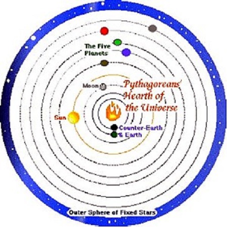 Η θεωρία του Φιλόλαου του Ταραντίνου (5ος αι. π.Χ.) ξεφεύγει από την αισθητηριακή εμπειρία και επηρεάζεται από την εσωτερική συνέχεια και αισθητική της μαθηματικής αντίληψης, η οποία στους Πυθαγόρειους συμβάδιζε με τον μυστικισμό. Θεωρεί λοιπόν ένα πεπερασμένο σφαιρικό σύμπαν, “στο κέντρο του οποίου βρίσκεται ο “βωμός συνοχή και μέτρο της φύσεως”, η εστία του παντός ή το κεντρικό πυρ όπως αναφέρεται, καθώς και ένα άλλο πυρ στην ανώτατη περιβάλλουσα τα πάντα σφαίρα. Το πρώτο είναι το κέντρο “εκ φύσεως” γύρω από το οποίο χορεύουν δέκα θεϊκά σώματα: ο ουρανός με τη σφαίρα των απλανών,(12) έπειτα οι γνωστοί πέντε ορατοί πλανήτες,(13) ο Ήλιος, κάτω από αυτόν η Σελήνη, η Γη και κάτω από αυτή η αντίχθονα και τέλος το πυρ σε θέση εστίας γύρω από το κέντρο”.