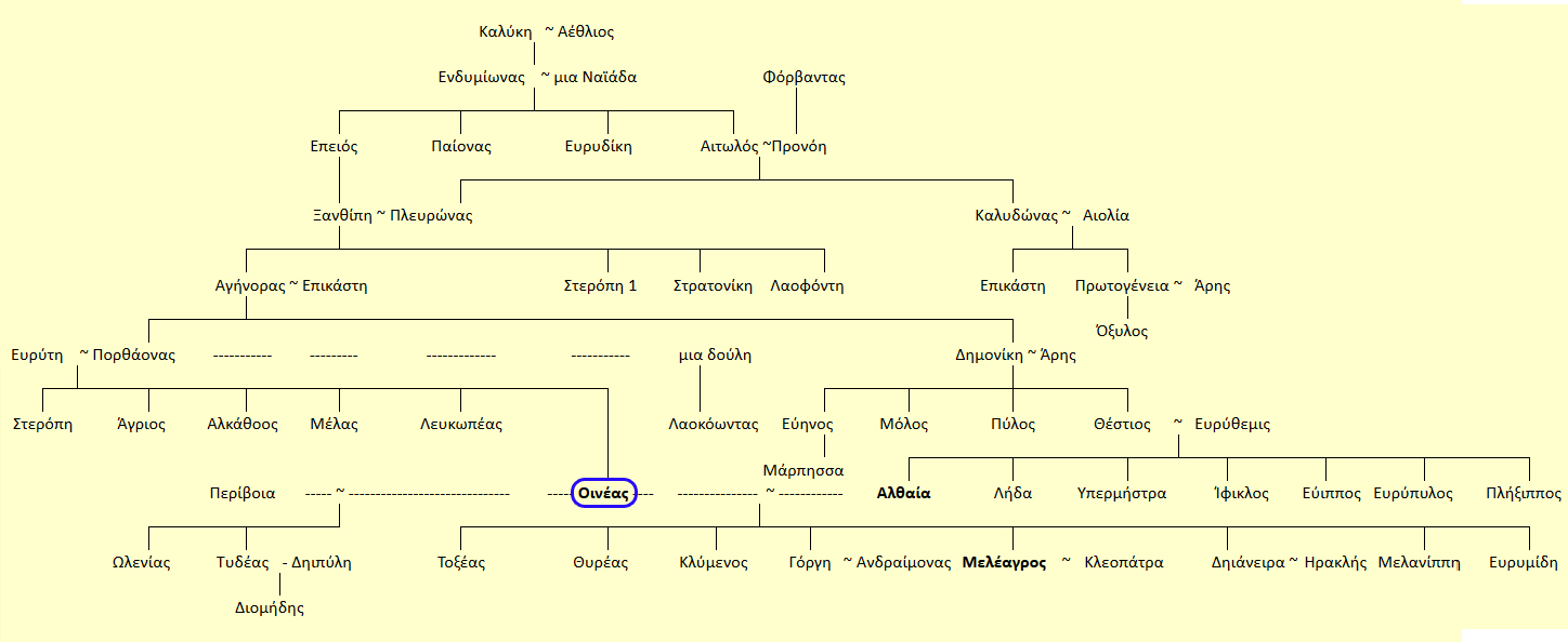 Ορισμένες παραδόσεις θέλουν τον βασιλιά της Καλυδώνας Οινέα απόγονο του Δευκαλίωνα. Η σειρά της διαδοχής μέχρι τον Οινέα έχει ως εξής: Γιος του Δευκαλίωνα, και αδελφός του Πρόνοου και του Μαραθώνα, ήταν ο Ορεσθέας, ο βασιλιάς της Αιτωλίας. Μία από τις σκύλες του γέννησε ένα κομμάτι ξύλου.