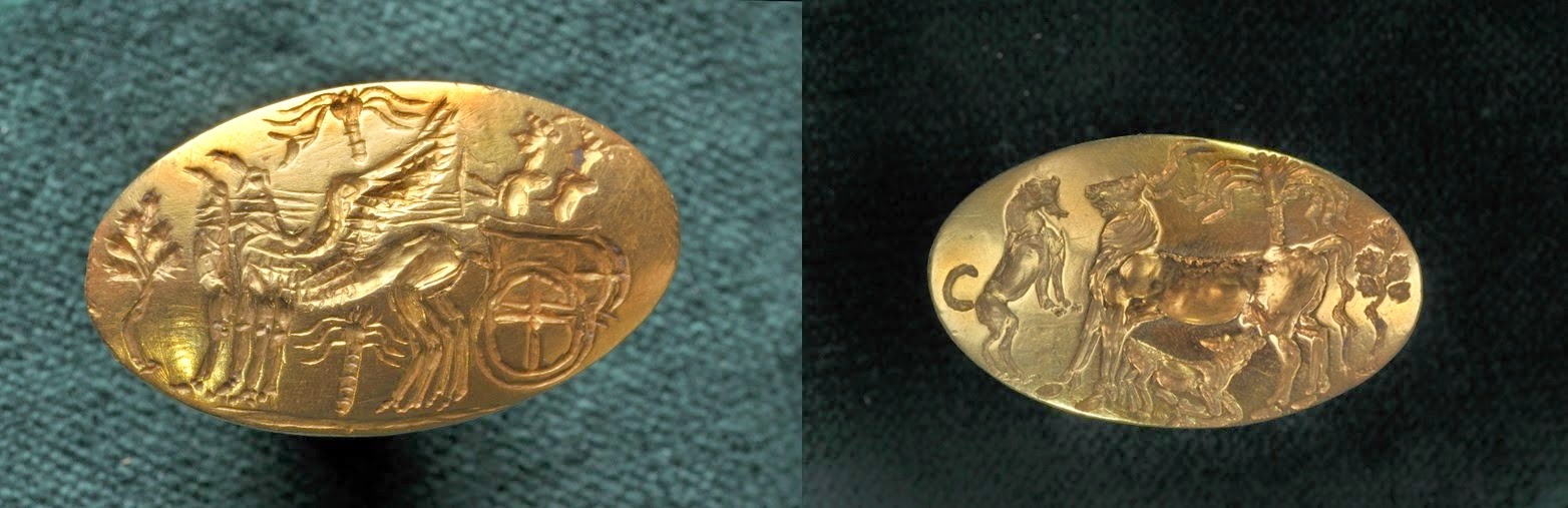 Αριστερά κάτω: Χρυσό δαχτυλίδι, με ανάγλυφη παράσταση άρματος, που σύρεται από γρύπες. Πάνω του στέκονται δύο ανθώπινες μορφές, οι οποίες κρατούν τα ηνία. Ανάμεσα στα πόδια των γρυπών και πάνω από τα φτερά τους απεικονίζονται δύο φοινικόδεντρα. Μπροστά από τους γρύπες υπάρχει άλλο δέντρο που έχει έξι μεγάλα φύλλα με οδοντωτό περίγραμμα, θέμα εμπνευσμένο από τη μινωική Κρήτη. Δεξιά κάτω: Χρυσός σφραγιστικός δακτύλιος, με φυσιοκρατική σκηνή.