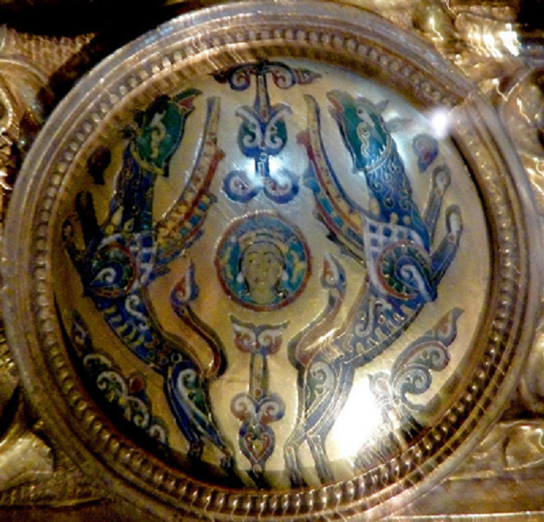 Η Pala d’ Oro φέρει και παράσταση ανθρώπου που φορά βασιλικό στέμμα ανάμεσα σε δύο γρύπες και που δεν είναι τίποτα άλλο παρά αναπαράσταση του φανταστικού ταξιδιού του μεγάλου Αλέξανδρου στους ουρανούς, όπως αυτό έχει περιγραφεί στο Μυθιστόρημα του Αλέξανδρου του Ψευδο-Καλλισθένη.Σύμφωνα με μία από τις περιγραφές αυτών των φανταστικών περιπετειών του, ο Αλέξανδρος κατά τη διάρκεια της επίσκεψής του στη χώρα των Μακάρων επιχείρησε να εξερευνήσει τους ουρανούς και για τον σκοπό αυτόν διέταξε να συλλάβουν δύο τεράστια όρνεα της περιοχής (γρύπες) τα οποία: