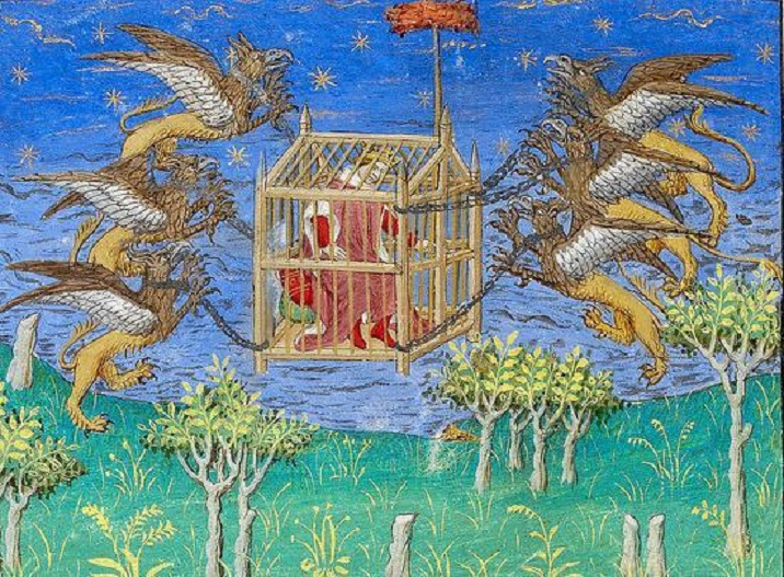 Απεικόνιση του Αλέξανδρου να ταΐζει συκώτια τους γρύπες και να πετάει στον ουρανό