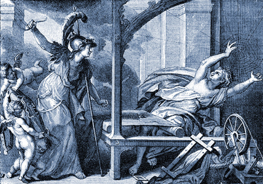 Η τελειότητα του υφαντού αλλά και η προσβλητική για τους θεούς επιλογή των θεμάτων, οι καλλιτεχνικές καινοτομίες της κοπέλας με την παραβίαση της κλασικής αρχής της ισορροπίας και την ισόρροπη απεικόνιση της αταξίας που προκαλούσε η απάρνηση της θεϊκής ταυτότητας από τους ίδιους τους θεούς, χωρίς να στερούνται τη δύναμή τους, προκάλεσαν την οργή της Αθηνάς που από φθόνο για το έργο της θνητής αντιπάλου της κατέστρεψε το υφαντό και άρχισε να χτυπά την κοπέλα με τη σαΐτα του αργαλειού. Η νέα, στην οδύνη της μέσα, θέλησε να κρεμαστεί, η θεά τη λυπήθηκε, της χάρισε τη ζωή αλλά την καταδίκασε να ζει πάντα έτσι κρεμασμένη, η ίδια και οι απόγονοί της και με την κοιλιά τους, όχι με τα χέρια, να υφαίνουν τον ιστό τους. (Οβίδιος, Μεταμορφώσεις, 6. 133-145).
