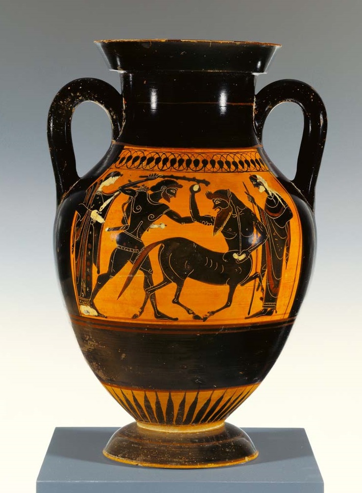 Σε ερυθρόμορφο κρατήρα με κιονόσχημες λαβές του 460-450 π.Χ., ο Ηρακλής παριστάνεται με το ρόπαλο υψωμένο να έχει ξεριζώσει το ένα κέρατο του Αχελώου, που εδώ εμφανίζεται σαν ταύρος με κεφάλι ανθρώπινο. Από το στόμα του θεού-ποταμού τρέχει νερό, ενώ η Δηιάνειρα, με νυφική φορεσιά, παρακολουθεί. Ο Αχελώος θεώρησε ότι νικήθηκε και ζήτησε πίσω το κέρατο, δίνοντας ως αντάλλαγμα στον Ηρακλή το κέρας της Αμαλθείας, το οποίο είχε πάρει από την κόρη του Ωκεανού Αμάλθεια, και από το οποίο έβγαιναν ποτά και φαγητά. Ο Ηρακλής με τη σειρά του το έδωσε στους Καλυδώνιους και λατρεύτηκε στα βουνά ως θεός της γονιμότητας και της ευφορίας που μπορεί να επέλθει με την ορθολογική διευθέτηση και τον έλεγχο των υδάτων.