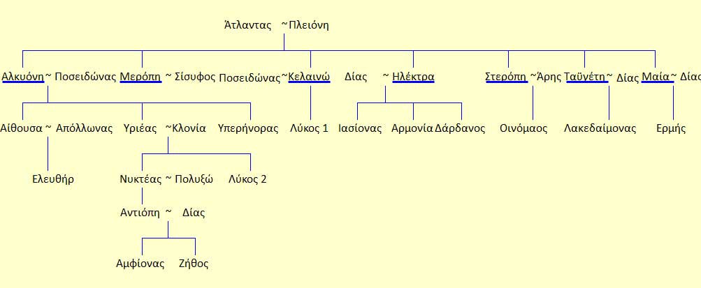 Από τον Άτλαντα και την κόρη του Ωκεανού Πλειόνη γεννήθηκαν επτά κορίτσια στην Κυλλήνη της Αρκαδίας, που τις είπαν Πλειάδες, η Αλκυόνη, η Μερόπη, η Κελαινώ, η Ηλέκτρα, η Στερόπη, η Ταϋγέτη, η Μαία. Σύμφωνα με άλλη παράδοση, που σώζεται σε απόσπασμα του Καλλίμαχου, οι επτά κοπέλες είναι κόρες μιας βασίλισσας των Αμαζόνων και ονομάζονταν Κοκυκώ, Πρωτίς, Γλαυκία, Παρθενία, Στονυχία, Λαμπαδώ, Μαία -μόνο η Μαία, μητέρα του Ερμή, είναι κοινή στους δύο καταλόγους. Αυτές καθιέρωσαν τα χορικά άσματα και τις νυχτερινές γιορτές. Ενίοτε Πλειάδες αποκαλούνταν και η Καλυψώ και η Διώνη.