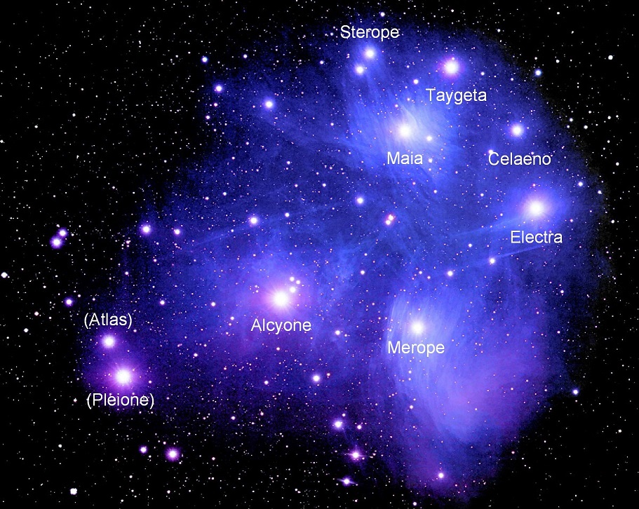 1. Τις Πλειάδες, μαζί με τη μητέρα τους Πλειόνη, αντάμωσε στη Βοιωτία ο κυνηγός Ωρίωνας που τις κυνήγησε για πέντε χρόνια. Ο Δίας, τελικά, τις λυπήθηκε και τις μεταμόρφωσε πρώτα σε περιστέρια και μετά σε αστέρι.