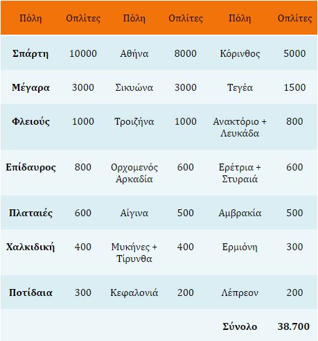 29. Όλοι αυτοί, εκτός από τους επτά είλωτες που αντιστοιχούσαν σε κάθε Σπαρτιάτη, αποτελούνταν από οπλίτες και η συνολική τους δύναμη έφτανε τους τριάντα οχτώ χιλιάδες επτακόσιους άνδρες. Ο αριθμός των οπλιτών, που συγκεντρώθηκαν κατά των βαρβάρων ήταν αυτός. Οι τριάντα πέντε χιλιάδες Σπαρτιάτες είλωτες που ανέφερα, όλοι τους μάχιμοι, και τριάντα τέσσερις χιλιάδες πεντακόσιοι ακόμα, που ανήκαν σε άλλες πόλεις της Λακεδαίμονας και άλλων περιοχών, σε αναλογία ένας βοηθητικός για κάθε πολεμιστή, αποτελούσαν το πλήθος των «ψιλών».