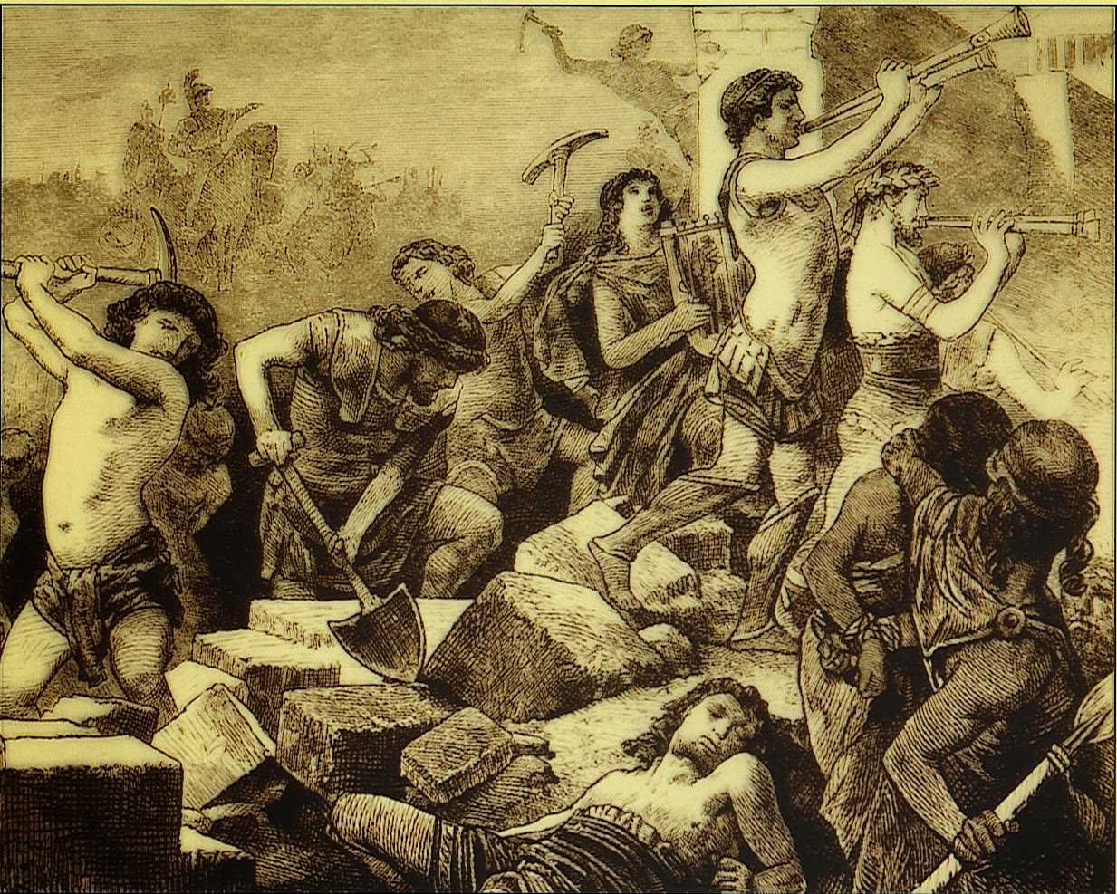 Άρχισαν, πράγματι, οι Αθηναίοι αφού αποφάσισαν την παράδοσή τους, με πολύ προθυμία να γκρεμίζουν τα Μακρά Τείχη υπό τη συνοδεία μουσικής αυλού, θεωρώντας ότι εκείνη η μέρα ήταν η αρχή της ελευθερίας για την Ελλάδα, καλώντας αυλητρίδες, όπως έκαναν σε συμπόσια και γιορτές.
